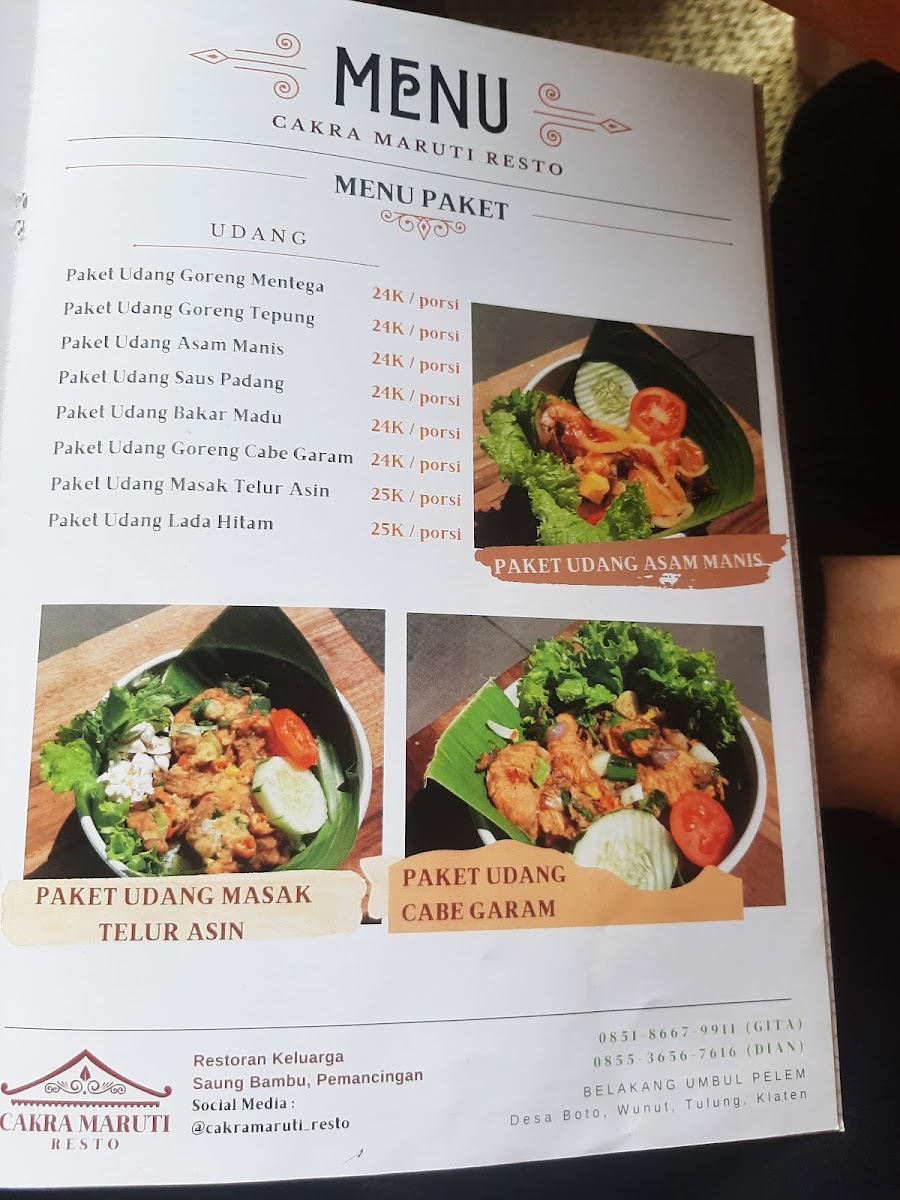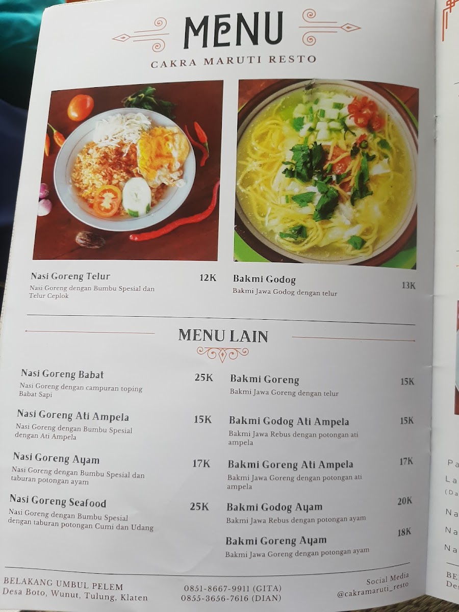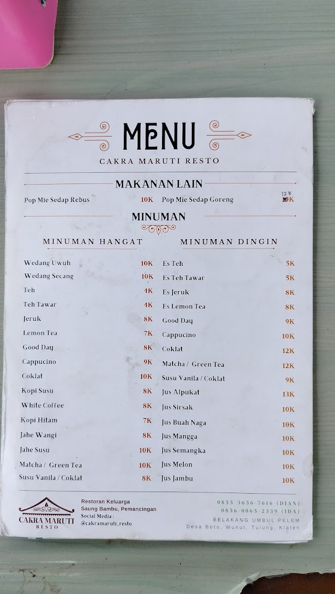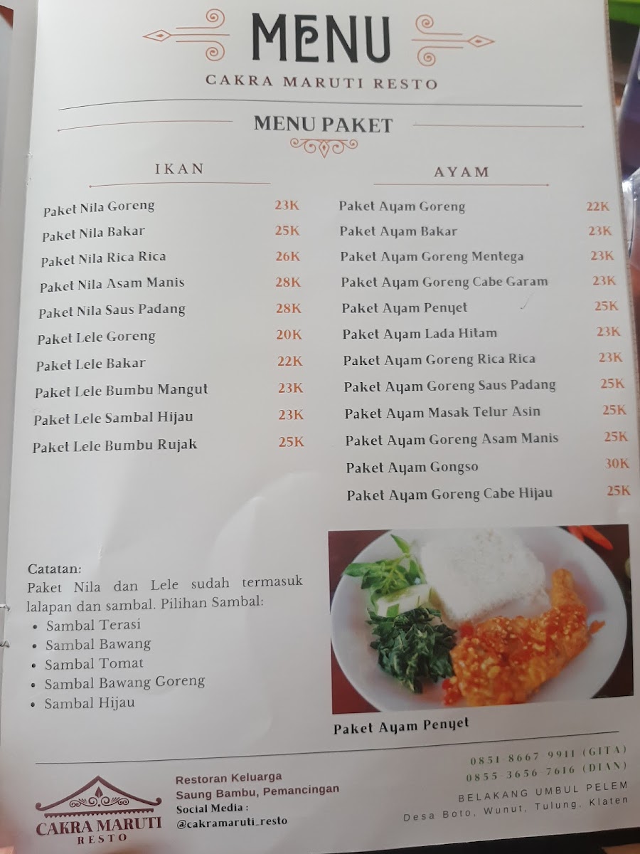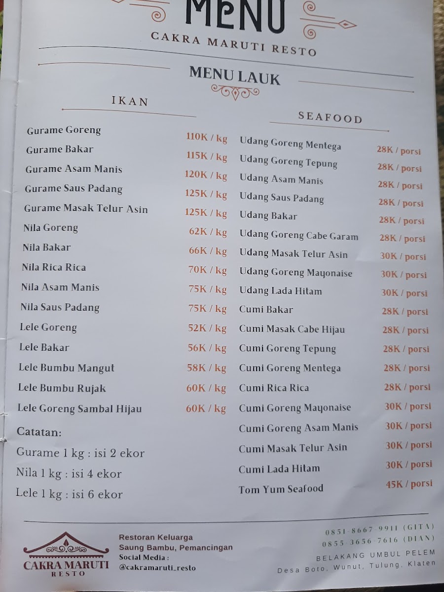 Welcome to Cakra Maruti, a delightful culinary gem nestled in Dukuh, Boto, Wunut, Tulung, within the scenic Klaten Regency of Central Java, Indonesia. This restaurant is not just a place to eat; it’s an inviting oasis where nature and good food intertwine. With its spacious dining areas and a unique fish pond, Cakra Maruti provides a delightful backdrop for those looking to escape the hustle and bustle. Whether you're here to enjoy a meal with family or engage in some light fishing, the ambiance is sure to charm you.