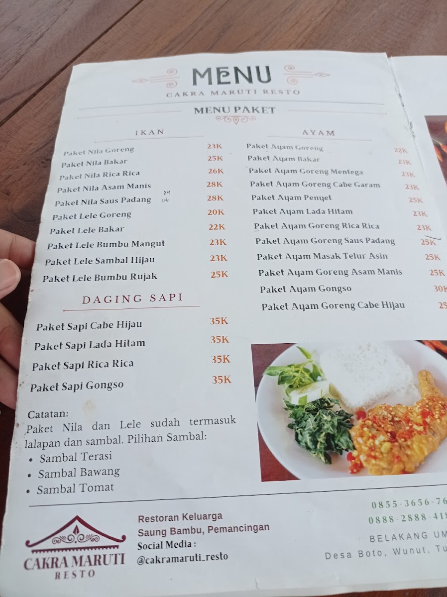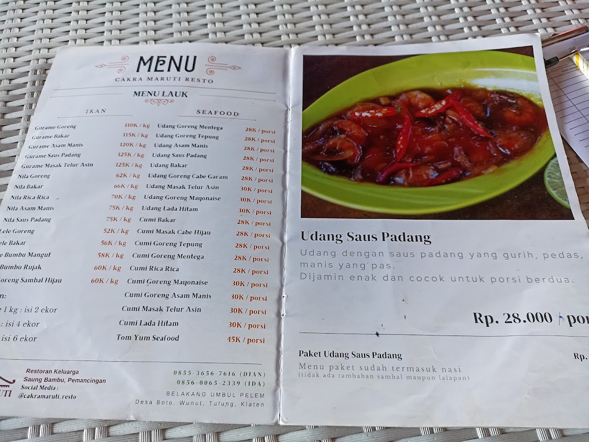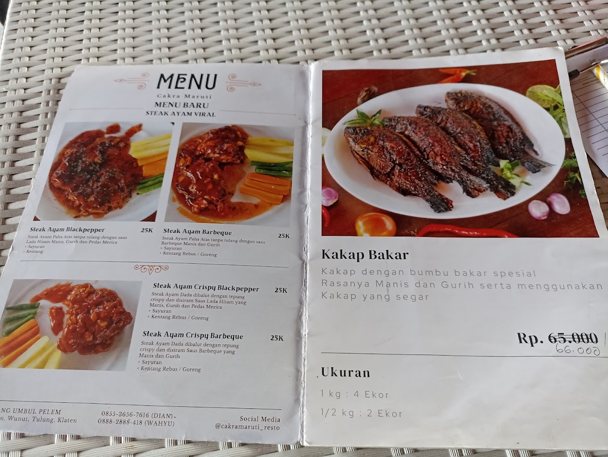 Cakra Maruti, nestled in the serene area of Dukuh Boto, Wunut, Tulung, Klaten Regency, is an enchanting dining destination that seamlessly blends comfort with a natural ambiance. Guests rave about its spacious fish pond, allowing for a unique fishing experience right on-site. The atmosphere here is warm and inviting, making it perfect for family gatherings. Diners are treated to an array of delightful dishes, with standout recommendations like the Beef Blackpepper, praised for its perfect seasoning. The service is attentive and friendly, ensuring your visit is enjoyable. With ample parking and a cozy setup, Cakra Maruti stands out for those seeking a memorable dining experience in Central Java.